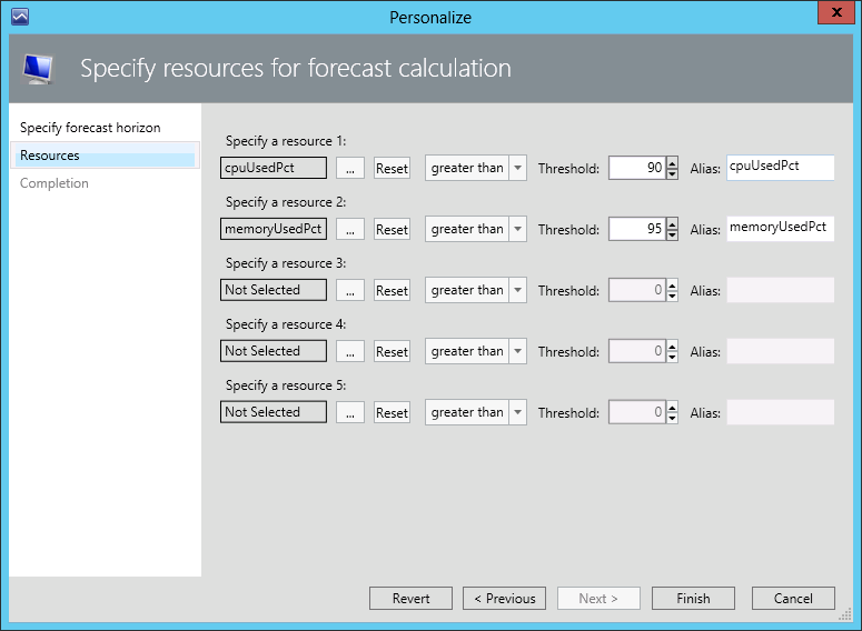 - At the Resources step, specify thresholds for performance metrics.