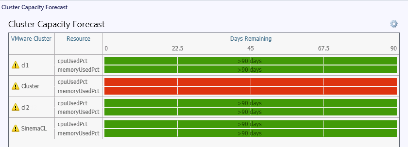 For example, the screenshot below shows the Cluster Capacity Forecast dashboard with specified thresholds for cpuUsedPct and memoryUsedPct metrics.