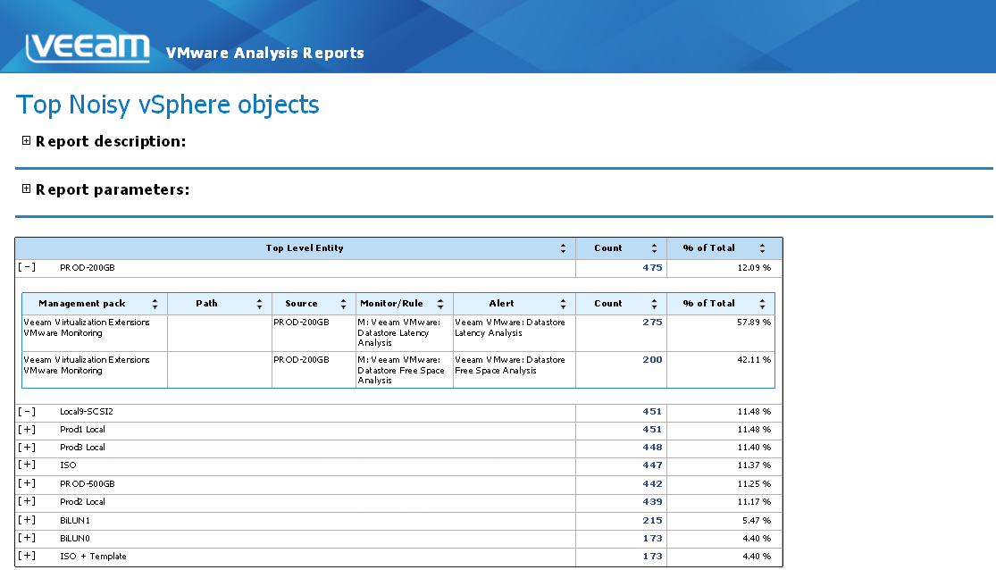 It can be seen from the report output below that the “Top Noisy” infrastructure object of the week was the PROD-200GB datastore since it caused: