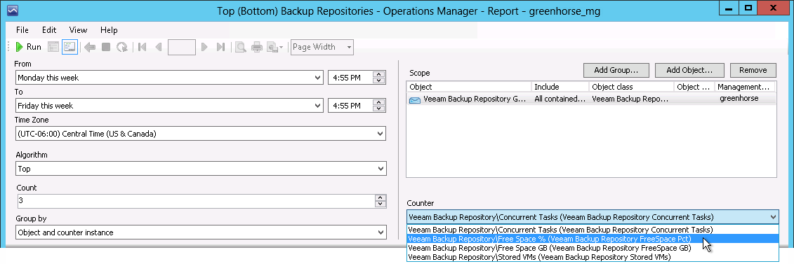 This is an archive version of the document. To get the most up-to-date information, see the current version. Step 7. Select Performance Counter To follow this example, in the Counter list, select the Veeam Backup Repository\Free Space % (Veeam Backup Repository FreeSpace Pct) counter.