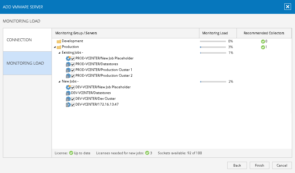 As this example requires the Development vCenter Server to be monitored with different settings, the jobs should be moved to the Development monitoring group. Use drag-and-drop in the Monitoring Load dialog to move all four DEV-VCENTER jobs to the Development group.