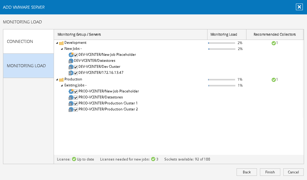 In the requirements for this example, monitoring load is well within limits for both groups. The Development vCenter cluster and stand-alone host are checked and will be monitored. All targets added in future will be monitored automatically and all new jobs for this vCenter Server will be placed in the same Development monitoring group.