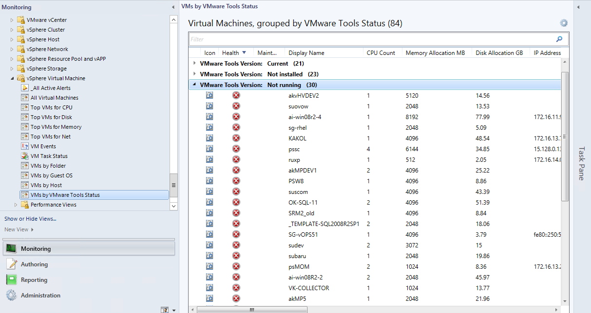 Numerous Grouped State views are available in view subfolders, with group filtering using properties. Example screenshot below shows all virtual machines, grouped by the status of VMware Tools installation in the guest OS.
