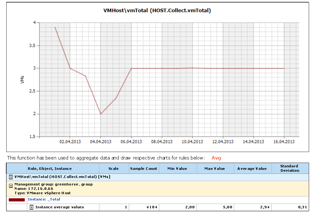 The table will detail daily VMs numbers (sample count, average, minimum and maximum and standard deviation values).