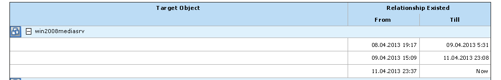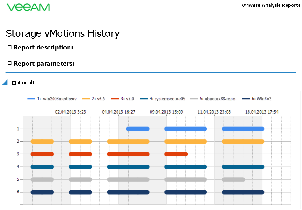 In this example, the report shows that VM #1 resided on the datastore from 08.04. 19:17 to 09.04. 5:31, then from 09.04 15:09 to 11.04. 23:08, and then from 11.04. 23:37 till the present tome.