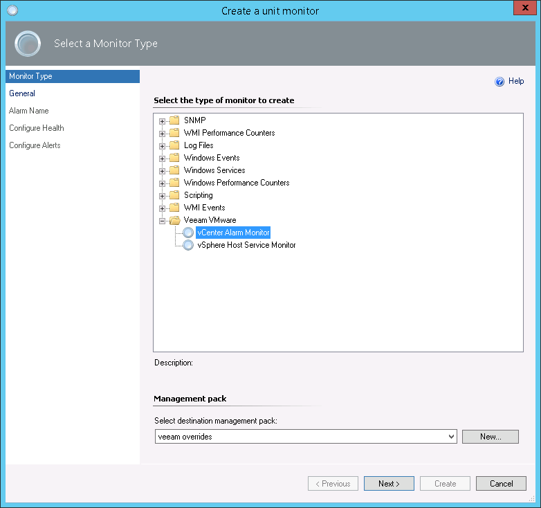 - At the Monitor Type page, choose Veeam VMware\ vCenter Alarm Monitor.