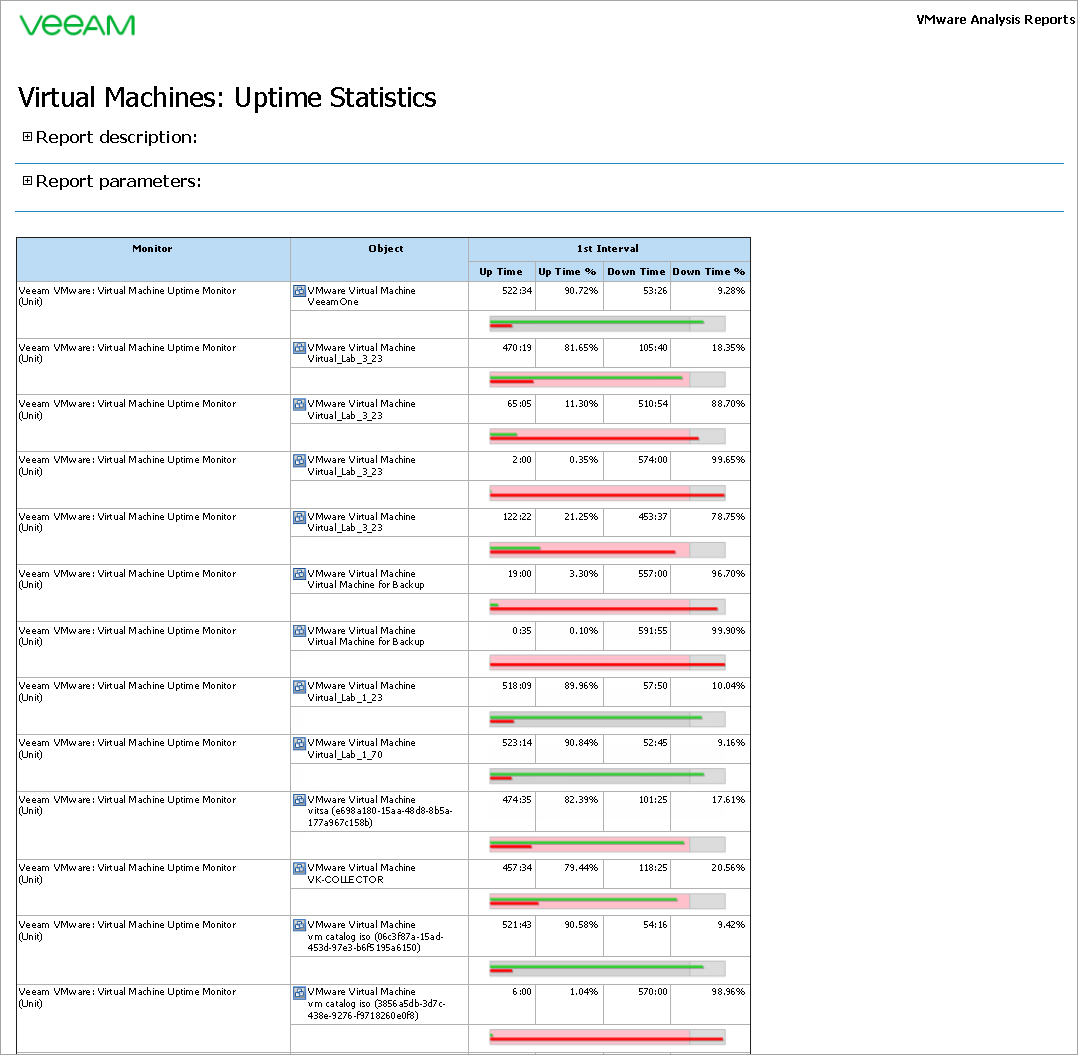 This report is designed to track VM availability, by reporting on the monitor Veeam VMware: Virtual Machine Uptime Monitor.
