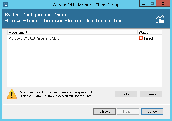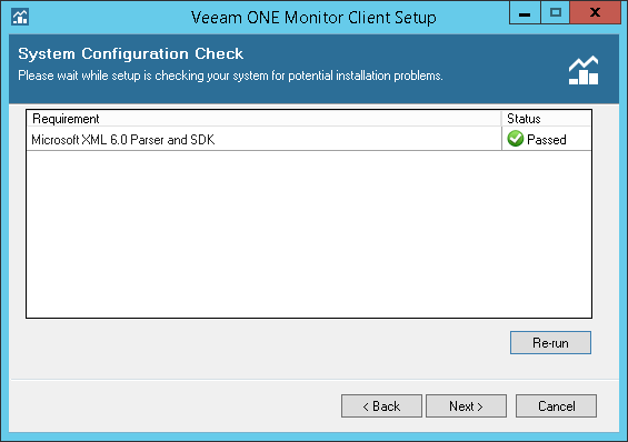 Before proceeding with the installation, the installer will perform system configuration check to determine if all prerequisite software is available on the machine. To learn what software is required for Veeam ONE installation, see System Requirements.