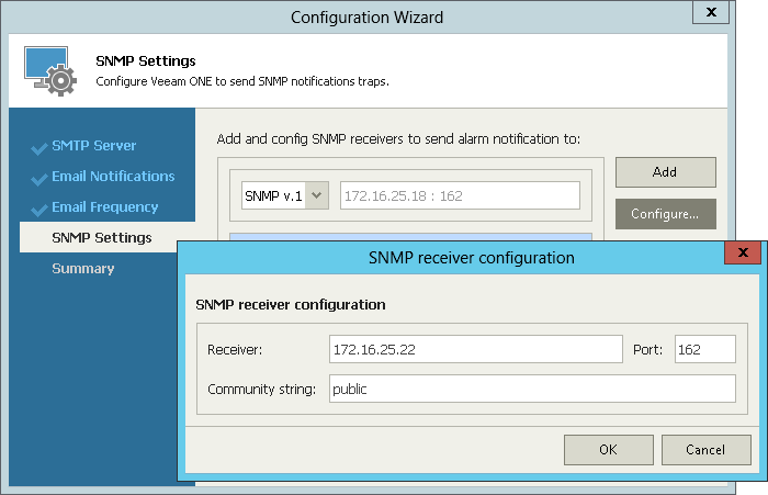 At the SNMP Settings step of the wizard, specify trap notification settings that can be used for sending notifications about alarms.