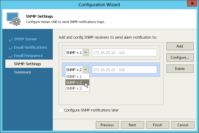 - In the list of SNMP receivers, choose the version of the SNMP protocol to be used.