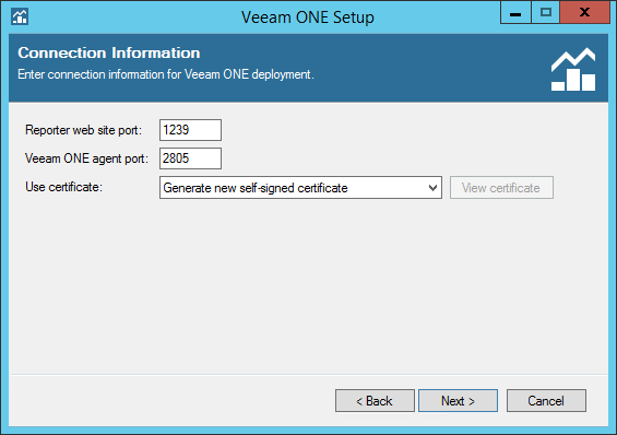 At the Connection Information step of the wizard, specify connection settings for Veeam ONE Reporter website and Veeam ONE agent: