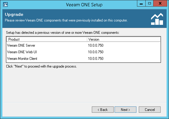 Veeam ONE Setup wizard will automatically detect components of the previous version installed on the machine. At the Upgrade step of the wizard, review the components to upgrade.
