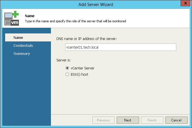 This is an archive version of the document. To get the most up-to-date information, see the current version. Step 3. Specify Server Name and Role At the Name step of the wizard:Specify DNS name or IP address of the server that you want to connect. Specify the server role — vCenter Server or a standalone ESXi host.