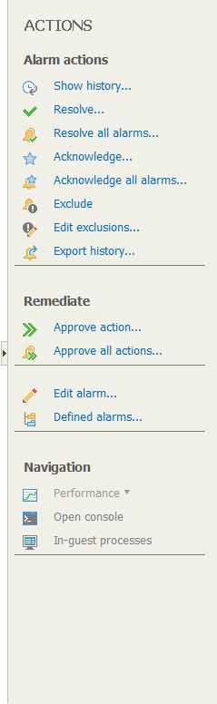Options displayed on the pane depend on the object type selected in the information pane. For example, if you select a VM in the inventory pane and open the list of triggered alarms for this VM, all alarm actions, object actions, and navigation actions will be available in the Actions pane. If you select a storage object in the inventory pane, some navigation actions will become unavailable as they do not apply to storage objects. For more information on working with alarm actions, see Veeam ONE Working with Alarms Guide.