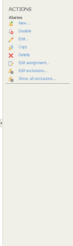 In a similar manner, if you open the Alarm Management section and select the All Alarms node in the inventory pane, the New action will become unavailable, as you must select a particular object to create a new alarm.