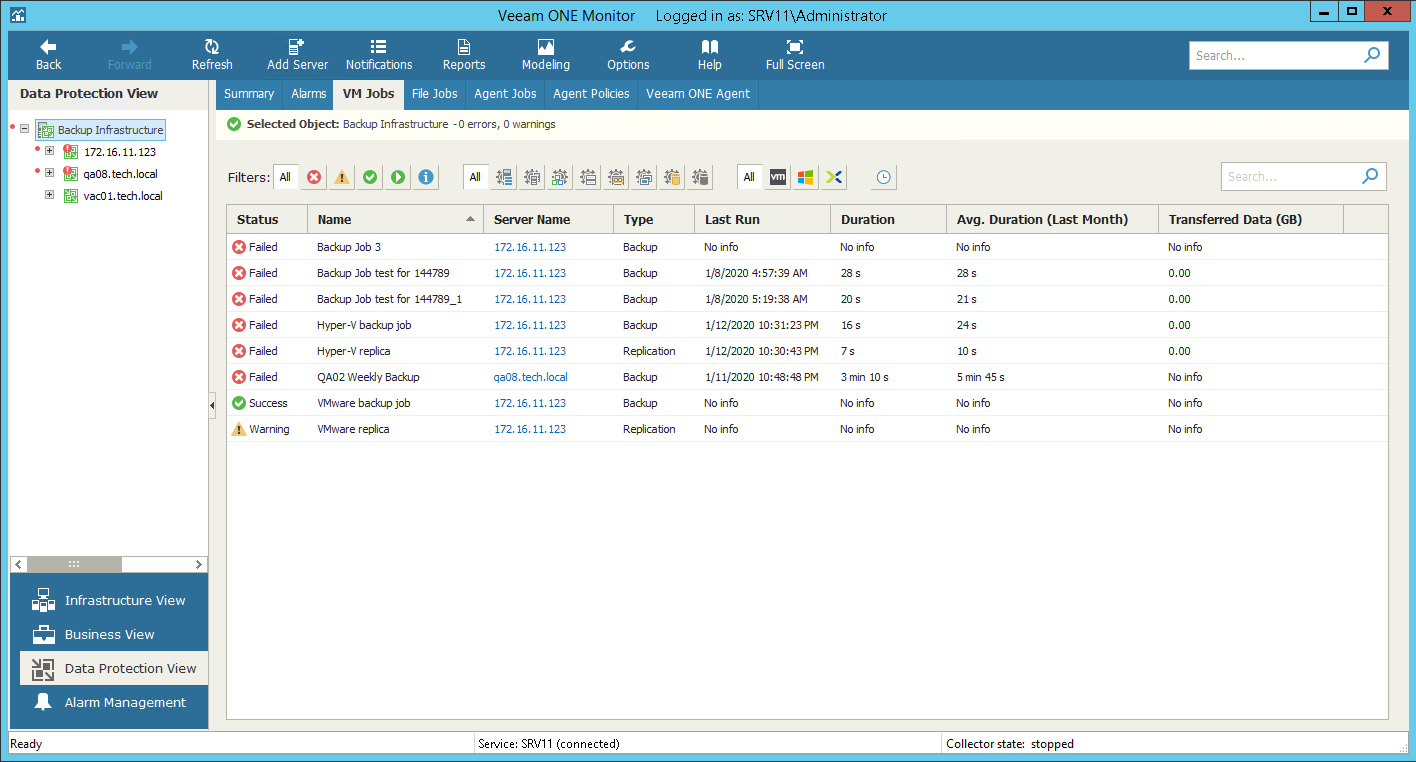 Veeam ONE Monitor allows you to track backup, replication, SureBackup, backup copy, backup to tape, SQL database transaction log backup, Oracle database backup, file to tape, VM copy and file copy jobs configured to protect the virtual environment with Veeam Backup & Replication.