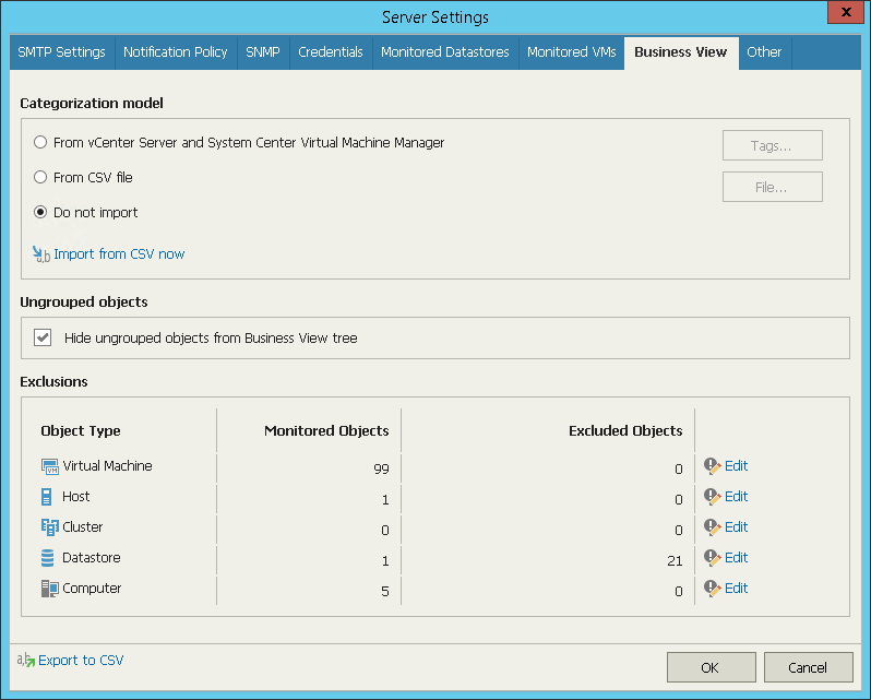 You cannot enable synchronization with vCenter Server and System Center Virtual Machine Manager tags and properties and a CSV file at the same time. When you switch between these options or disable import, Veeam ONE Monitor deletes all previously imported categories. |