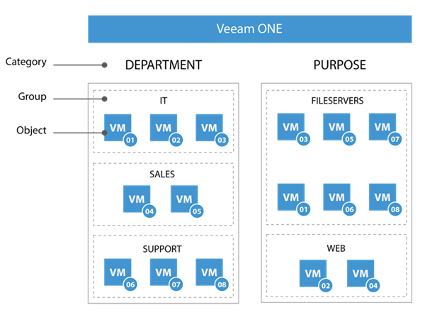 In Veeam ONE Monitor you can categorize the following types of objects: clusters, hosts, storage objects, VMs, and computers protected with Veeam Backup Agent for Windows and Veeam Backup Agent for Linux. You can include an object into one or more groups within a category.