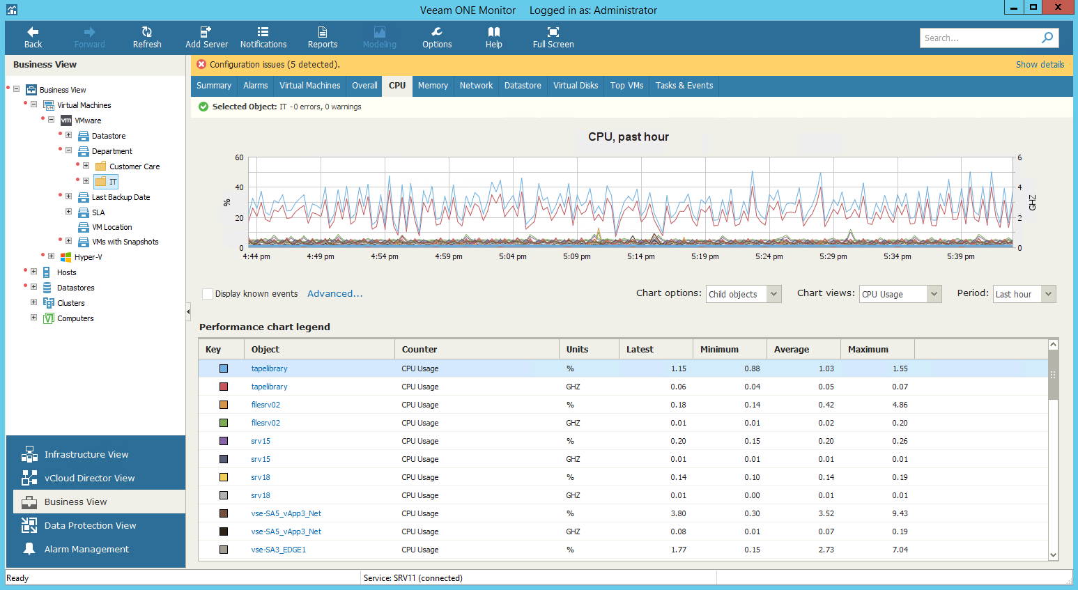 For Business View, Veeam ONE Monitor supports all dashboards that apply to categorized virtual infrastructure objects — VMs, hosts, clusters and datastores.