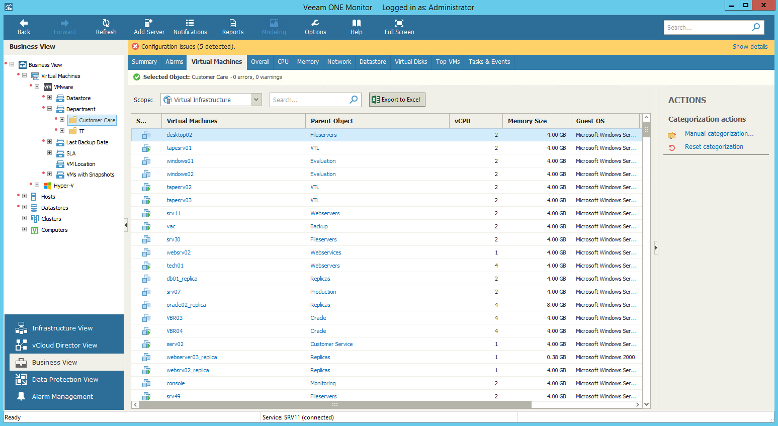 You can view the list of infrastructure objects within the Business View node — object type, platform, category and group.