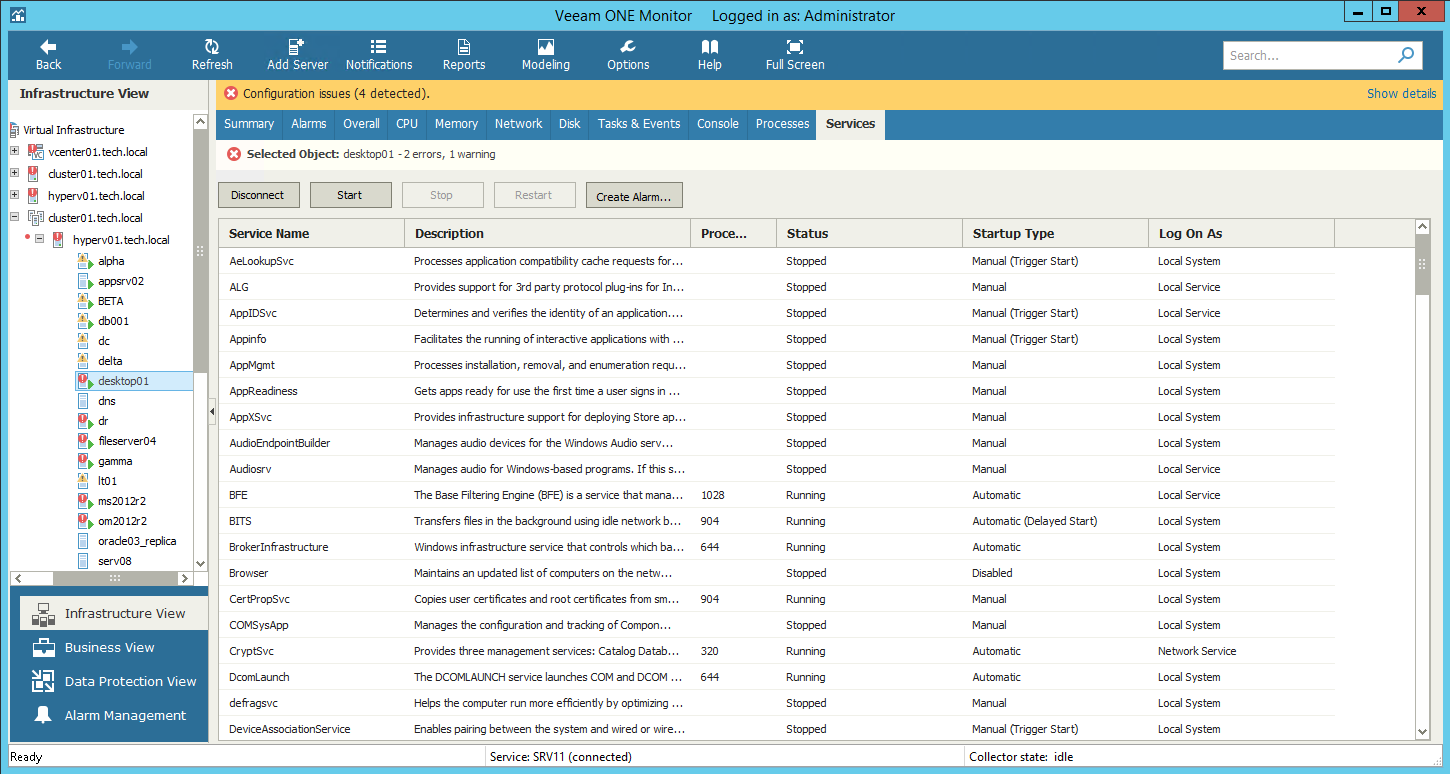 - For Windows-based machines, you can view, start, stop and restart services, and create alarms based on retrieved services.