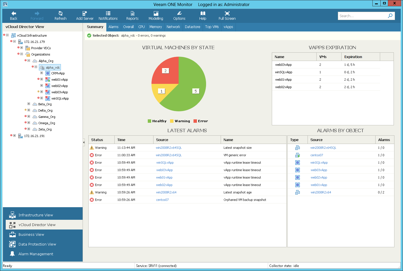 Every colored segment represents the number of VMs in a certain state — VMs with errors (red), VMs with warnings (yellow) and healthy VMs (green). Click a chart segment or legend label to drill down to the list of alarms triggered for VMs with the chosen health status.