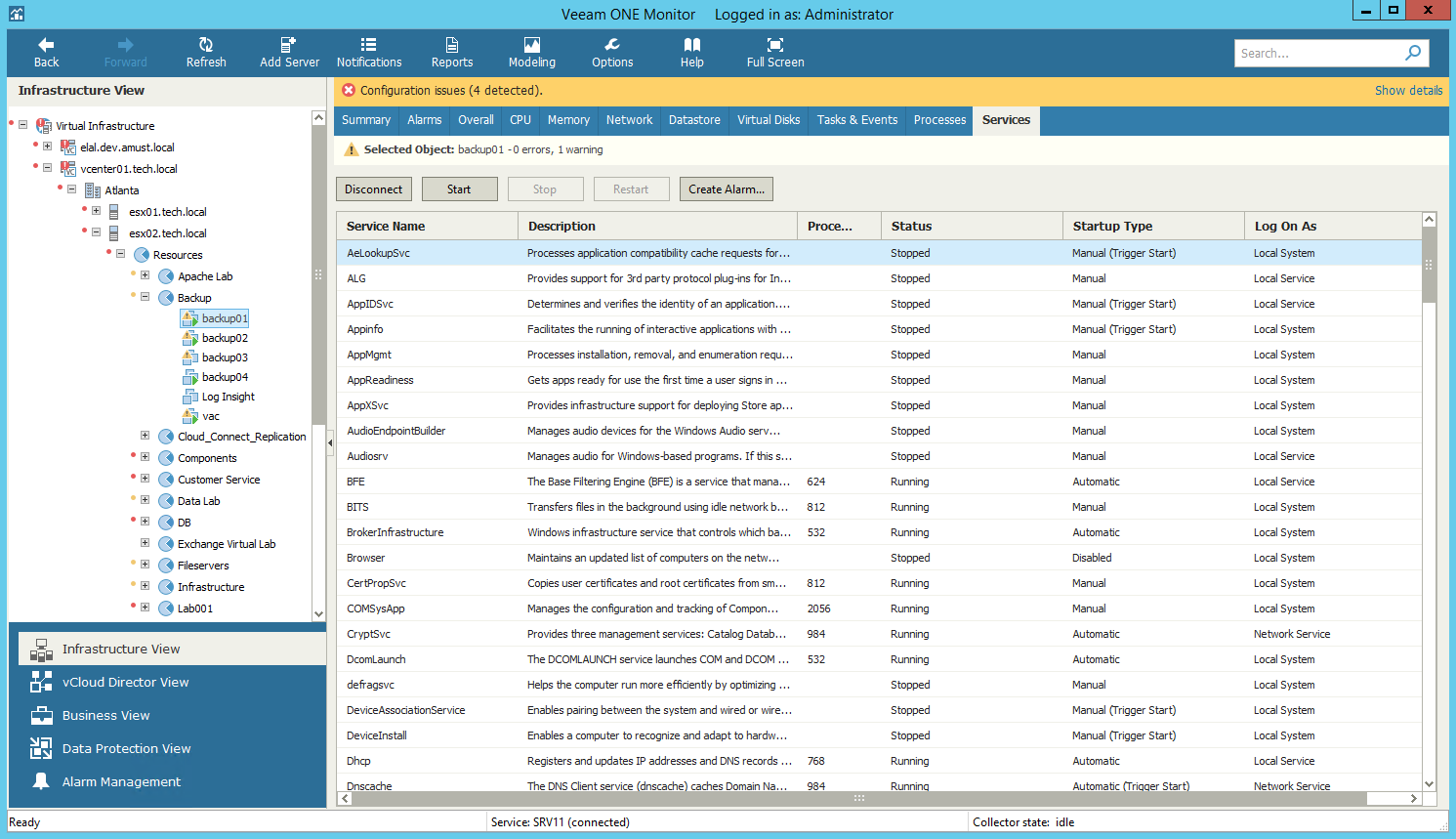 - For Windows-based machines, you can view, start, stop and restart services, and create alarms based on retrieved services.