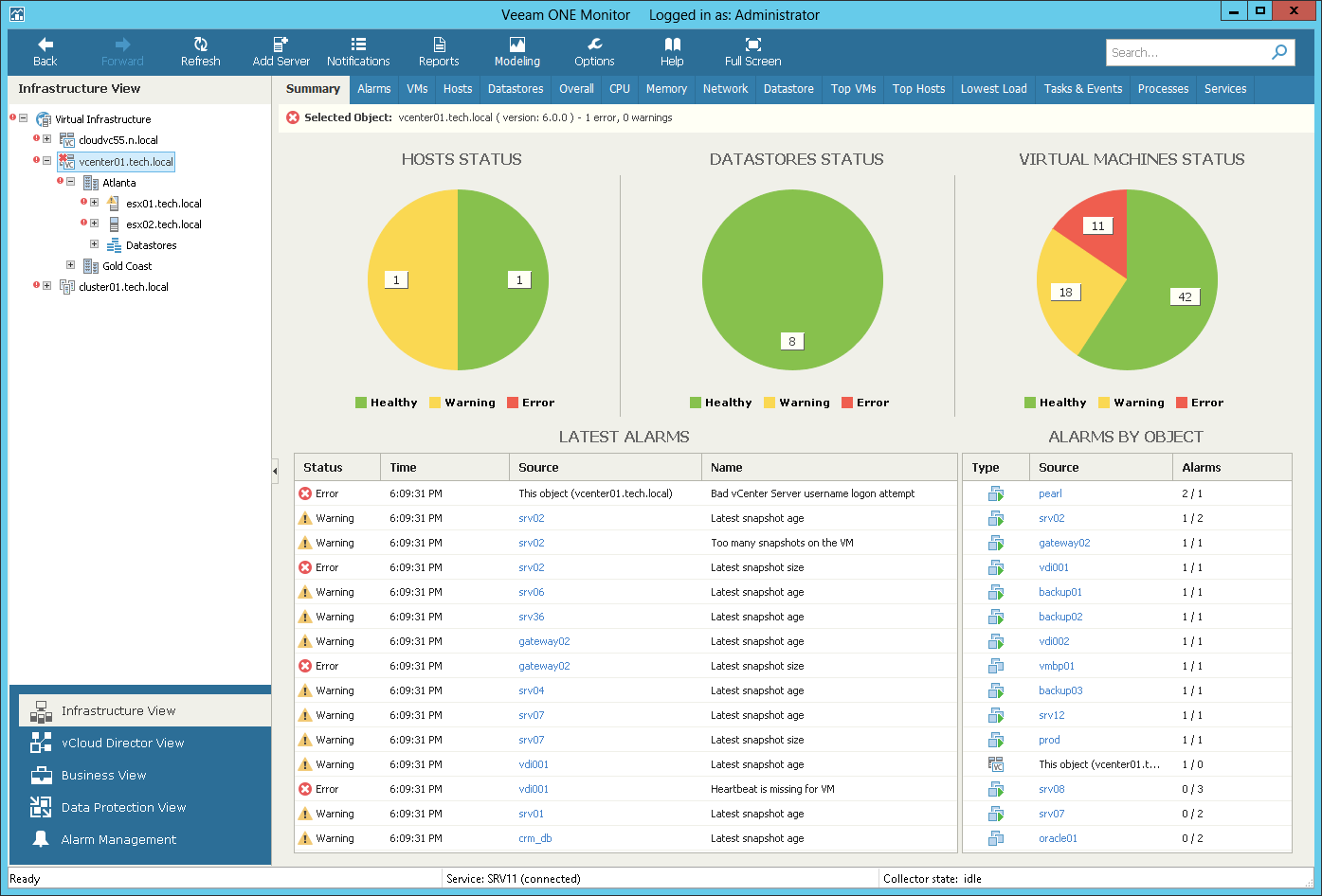 Every chart segment represents the number of objects in a certain state — objects with errors (red), objects with warnings (yellow) and healthy objects (green). Click a chart segment or a legend label to drill down to the list of alarms with the corresponding status for the selected type of virtual infrastructure objects.