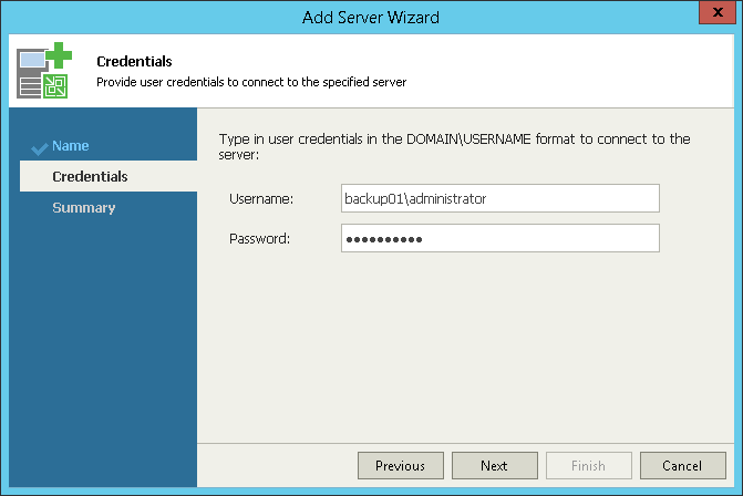- At the Credentials step of the wizard, specify credentials of the user account for connecting the server in the DOMAIN\USERNAME format.
