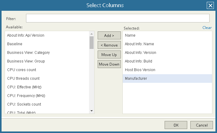 - Columns: defines configuration properties to analyze in the report. The list of available properties will depend on the selected object type. Use the Filter field to search for the necessary properties by name. Select the Name, About Info: Name, About Info: Version, About Info: Build, Host Bios Version and Manufacturer properties in the Available list and click Add.