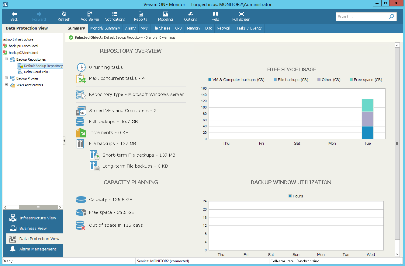 Storage capacity is one of the key repository metrics that you must take into account when configuring backup job frequency, retention policy, compression and so on. If you know when and whether a repository is about to run out of free space, you can prevent potential problems.