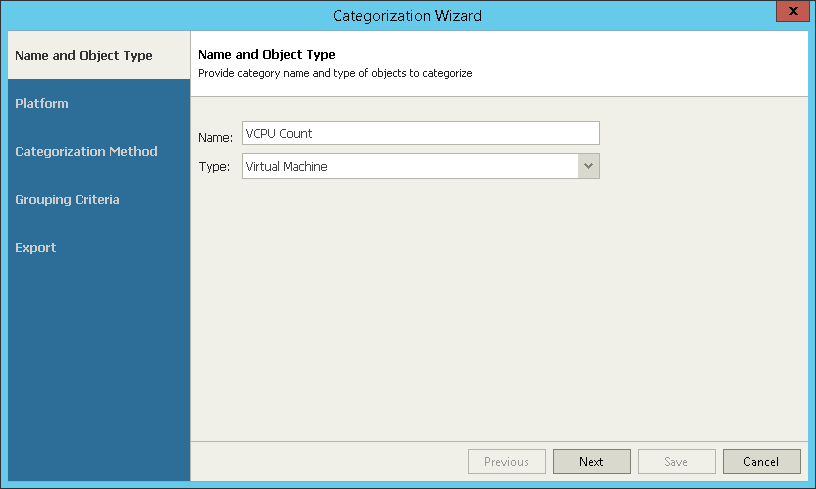 - At the Name and Object Type step, enter a category name and make sure that Virtual Machine is selected as the object type.