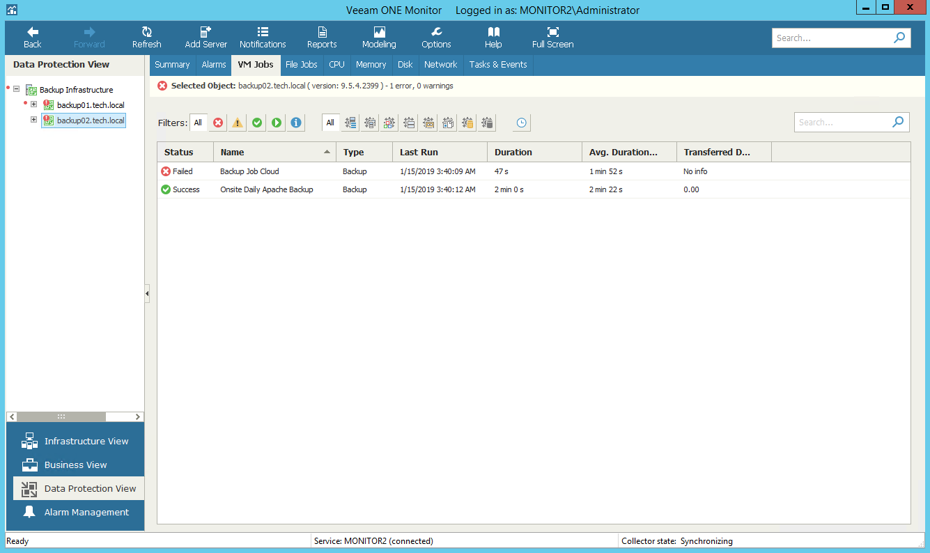 You can monitor all types of jobs configured on the Veeam Backup & Replication servers that you connected to Veeam ONE in the Connecting Veeam Backup & Replication Servers section.