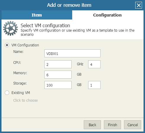 - To choose an existing VM that will be used as a template in the scenario, select the Existing VM option and choose a VM from the list.