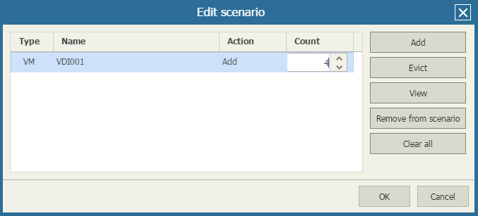 - In the Edit scenario window, select the scenario entry, click the Count field and specify the number of VMs to be added.
