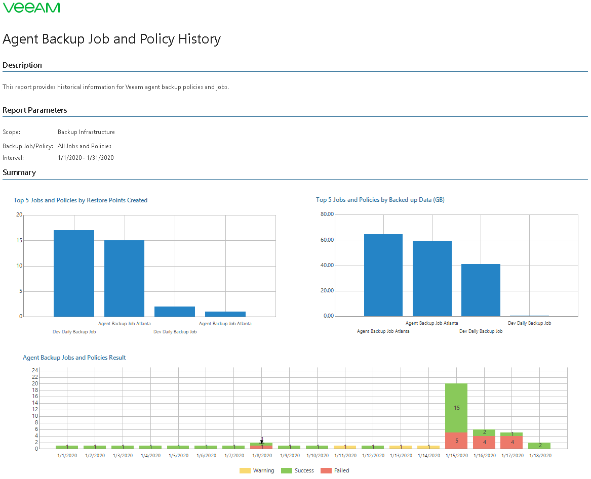 This report provides historical information for Veeam agent backup policies and job sessions results.