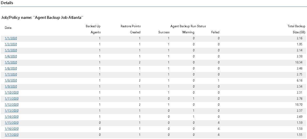 The Details table provides information on each performed agent backup job: session date, number of backed up agents and created restore points, the completion state and total backup size.