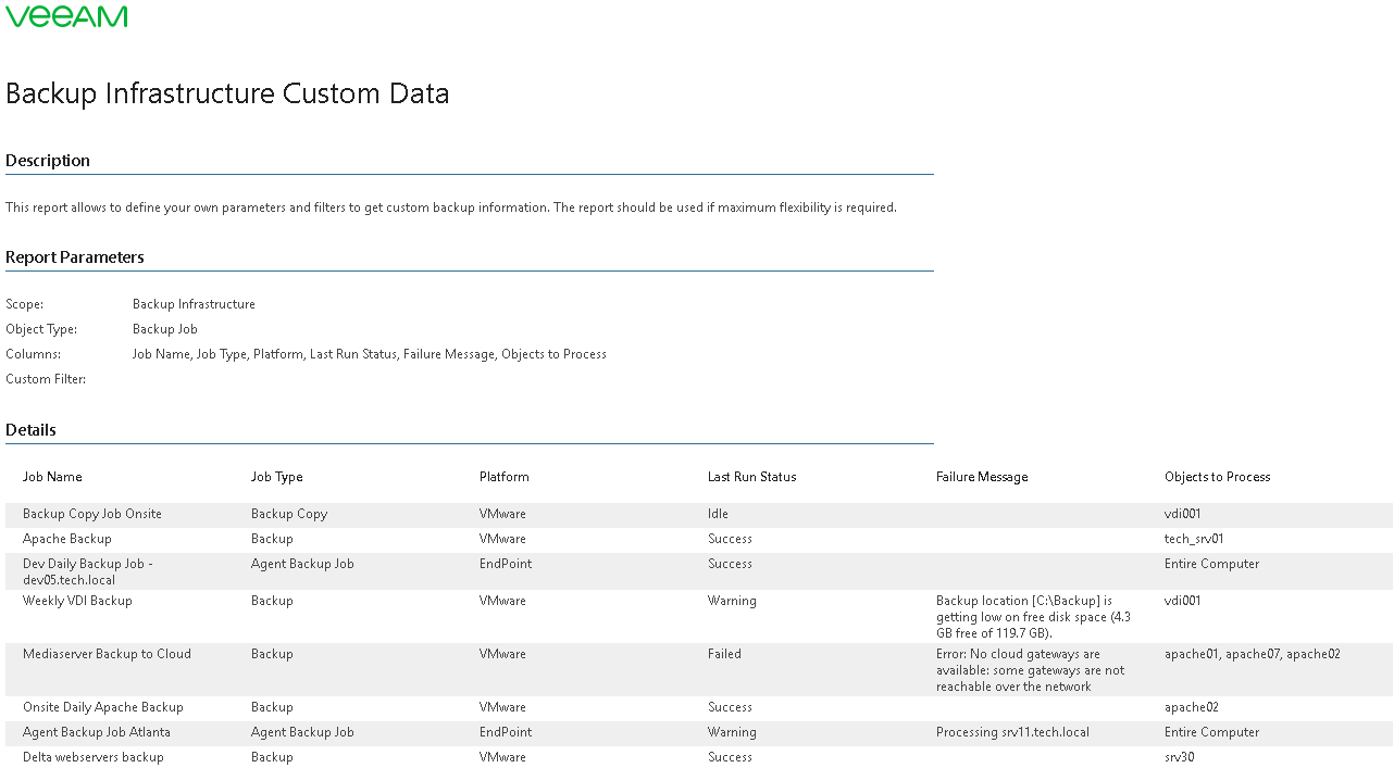 This report features a collection of custom properties for Veeam Backup & Replication objects, including backup servers, backup jobs, VMs and computers. The report helps you analyze data protection aspects not covered by Veeam Backup & Replication reports.