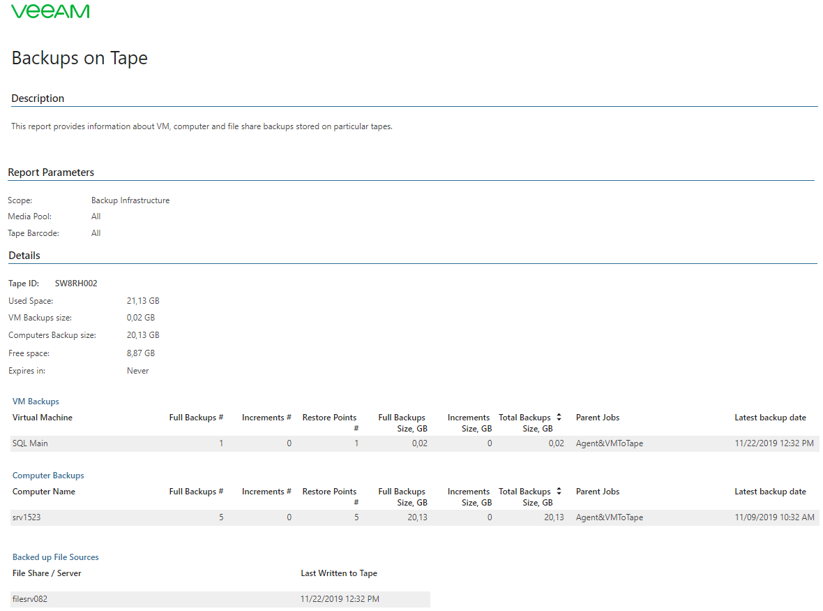 This report helps you monitor tape space usage and the amount of VMs, computers and file shares stored on tapes.