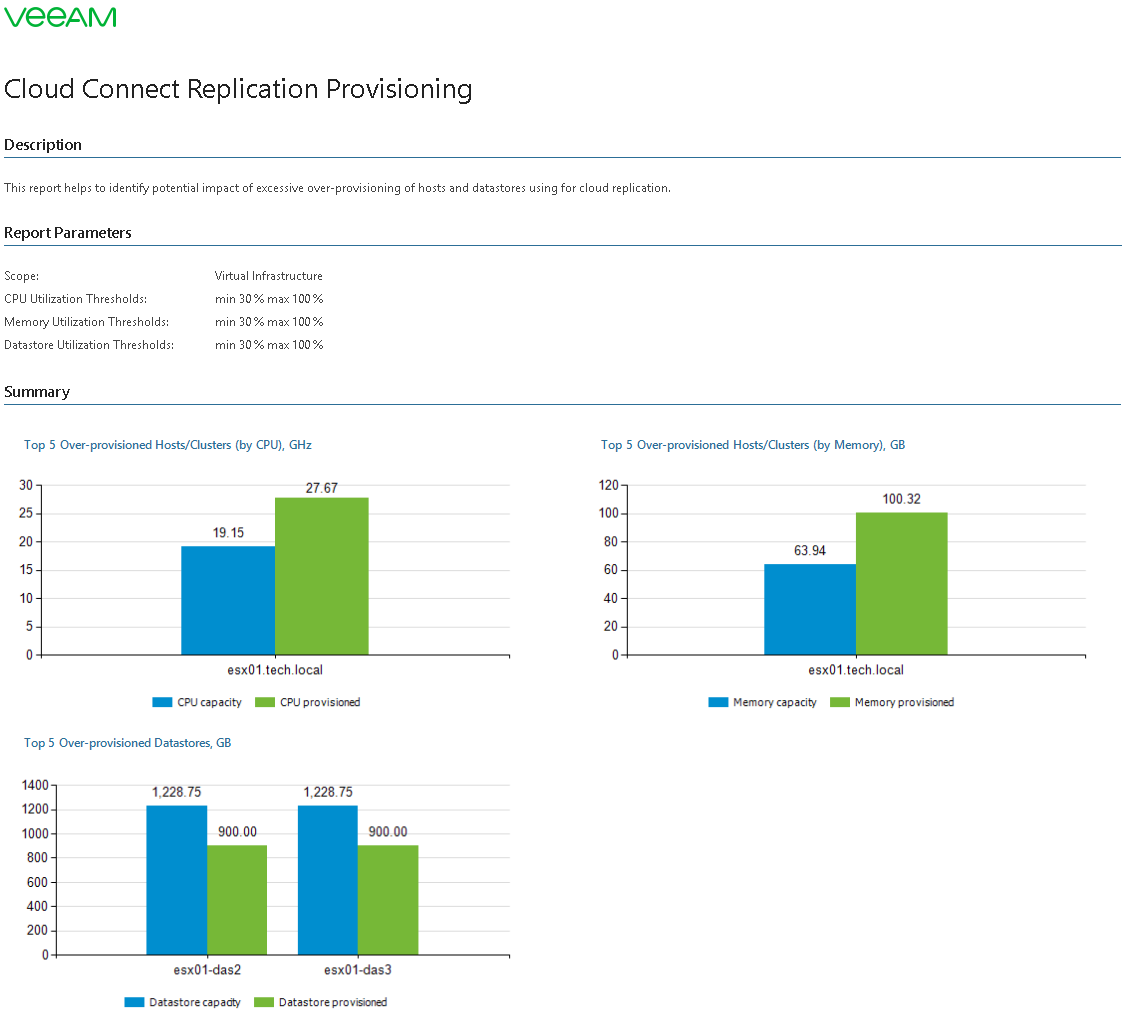 The report helps define whether existing hardware plans match hosts and datastores capabilities. Use this data to avoid potential issues that may be caused by excessive over-provisioning of cloud replication hosts.