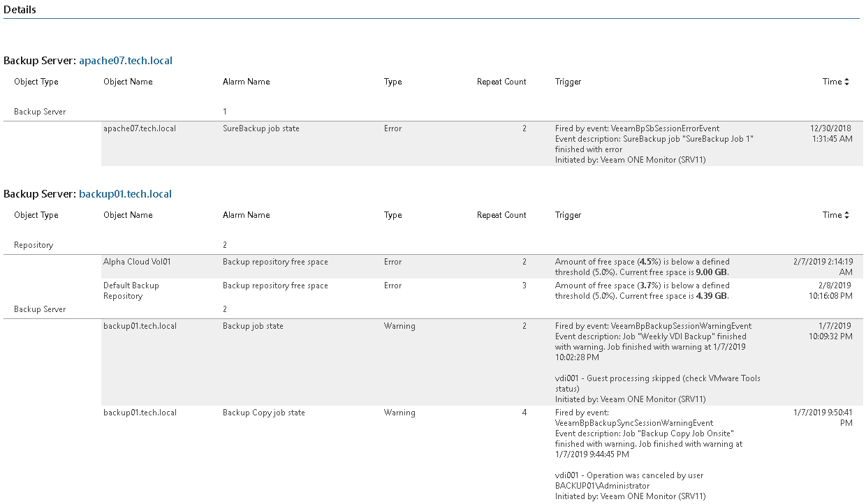 This report shows all unresolved alarms that Veeam ONE Monitor triggered for the Veeam Backup & Replication infrastructure.
