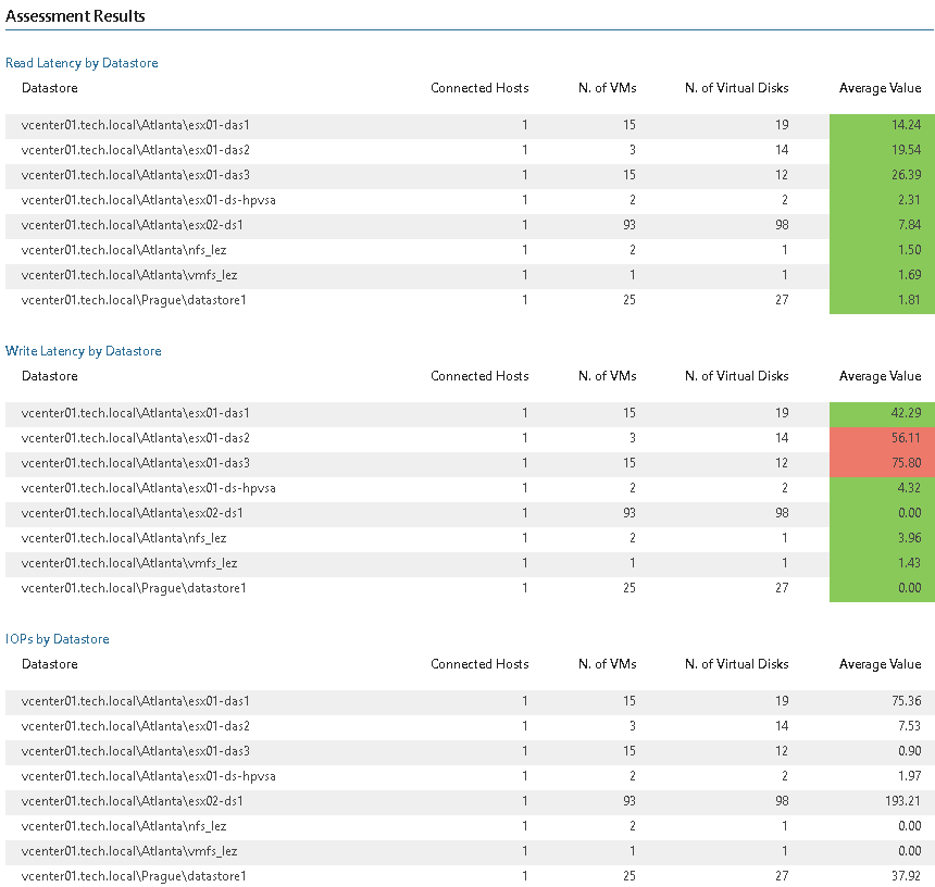 - The Assessment Results table shows the number of hosts connected to each datastore included in the report scope, the number of VMs that store data on the datastores, the number of virtual disks, and the average latency/IOPS values for each datastore. The report also provides recommendations on how to meet the defined parameters.