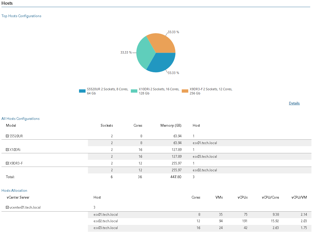 The report shows configuration properties of virtual servers, clusters, datastores, host systems and networks. The report also includes charts that illustrate distribution of VM power state, VMware Tools status and Business View groups across the infrastructure.