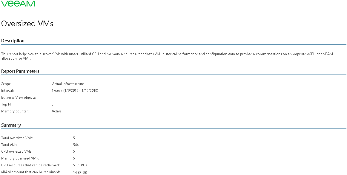 This report helps you to detect VMs that have more allocated vRAM or vCPU resources than they require. The report analyzes historical performance and configured resource allocation to provide recommendations for an optimized VM configuration and allocation of resources.