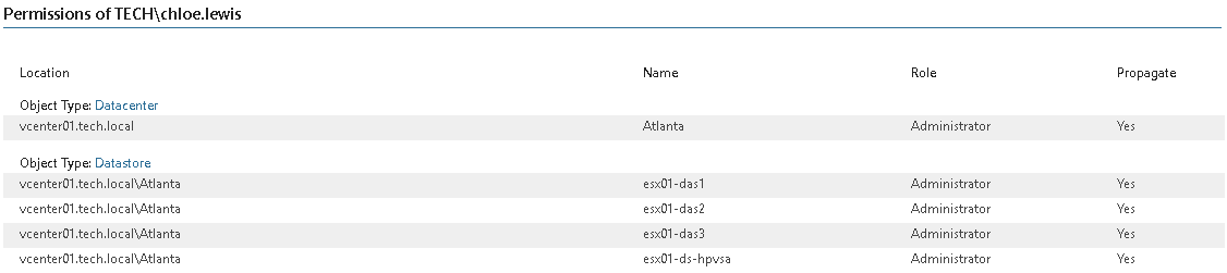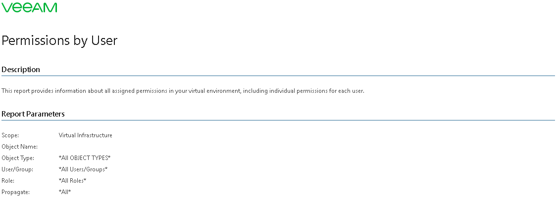 This report provides information about permissions assigned in your virtual environment, including individual permissions for every user. The report lists registered users and shows permissions that each user has for different virtual infrastructure objects.