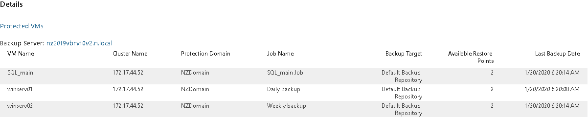 The Details section provides information on all protected and unprotected VMs including name of a Nutanix AHV cluster, protection domain to which the VM is added, job name, backup target, number of available restore points and date and time of the latest backup.