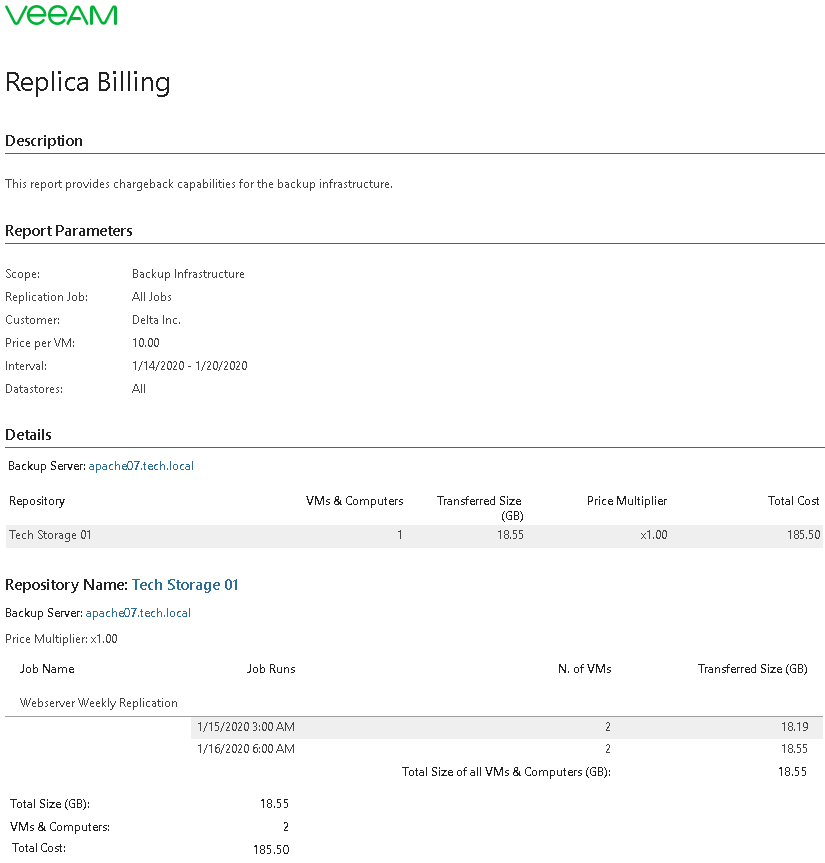 The report provides details on every replication job included into the report scope — the number of replicated VMs and total amount of gigabytes transferred to the storage — and estimates the total cost of the VMs.
