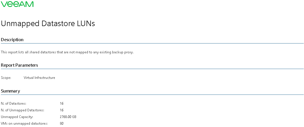 This report provides information about all detected shared datastores that are not mapped to any existing backup proxy. If you are going to use the Direct SAN Access mode, datastore LUNs must be mapped to a proxy server.