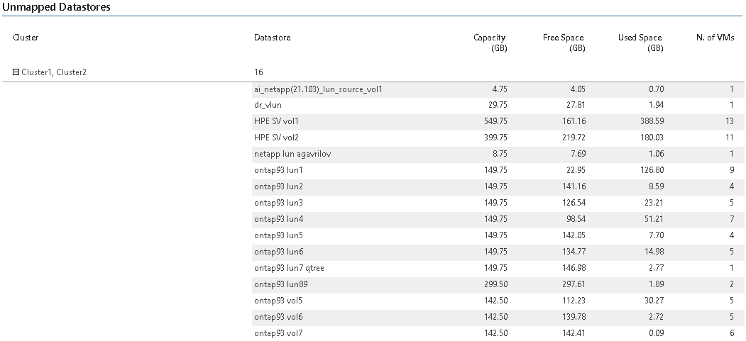 The Unmapped Datastores and Mapped Datastores sections display detailed datastore information, such as capacity the amount of free and used space, and the number of stored VMs.
