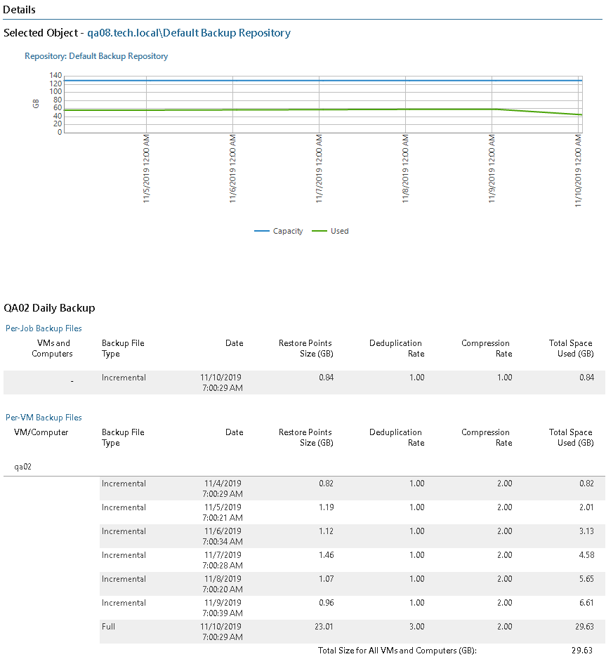 This report is useful for capacity planning purposes. The report allows you to assess historical growth of backup files and — in case backup files grow too fast — to decide whether to change job configuration to point it to another repository with larger capacity.